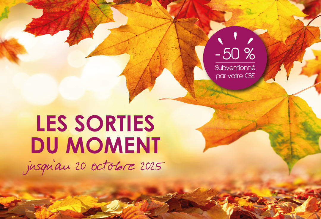 Profitez chaque mois d'offres subventionnées de votre CSE à -50%. Des sorties pour toute la famille proposées par une équipe dédiée. Accessible en ligne jusqu'au 20 du mois. Dans la limite des places disponibles et valable pour une commande.